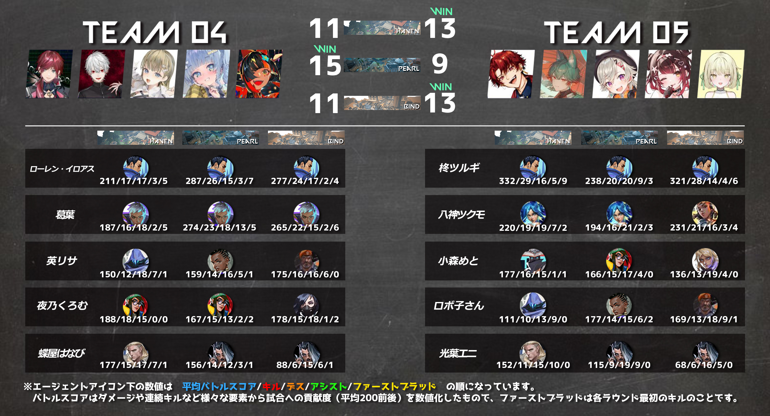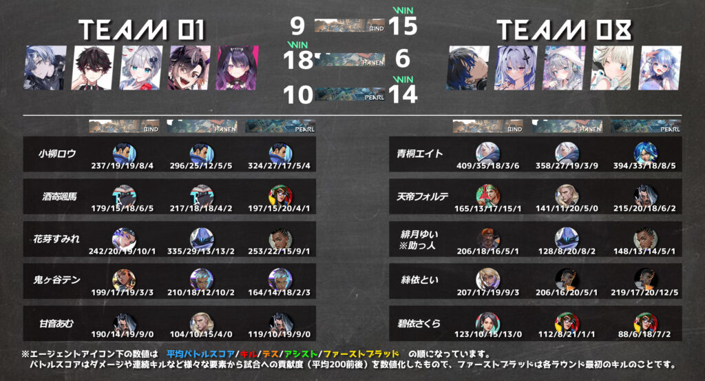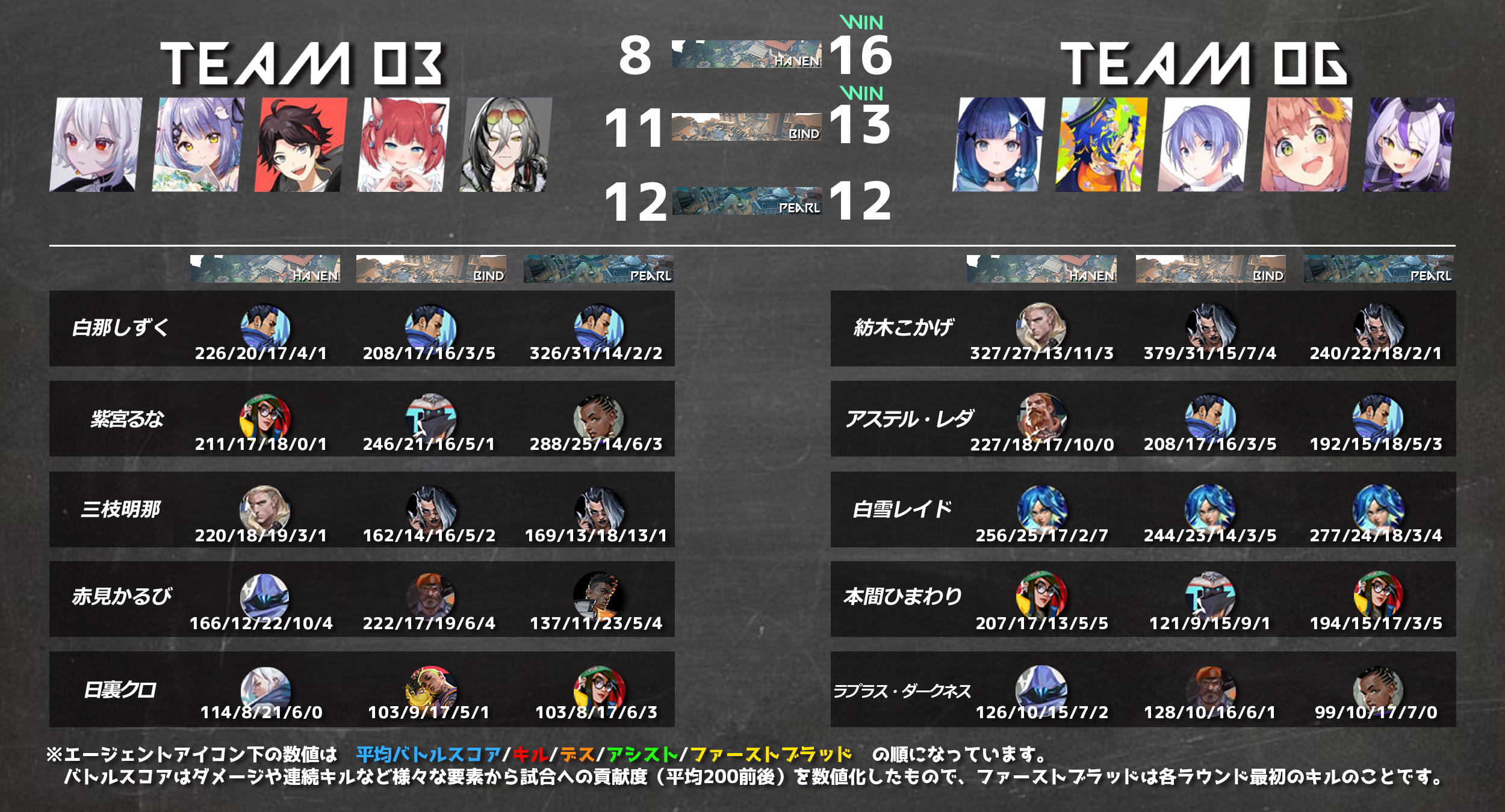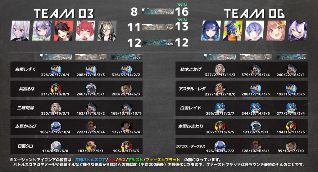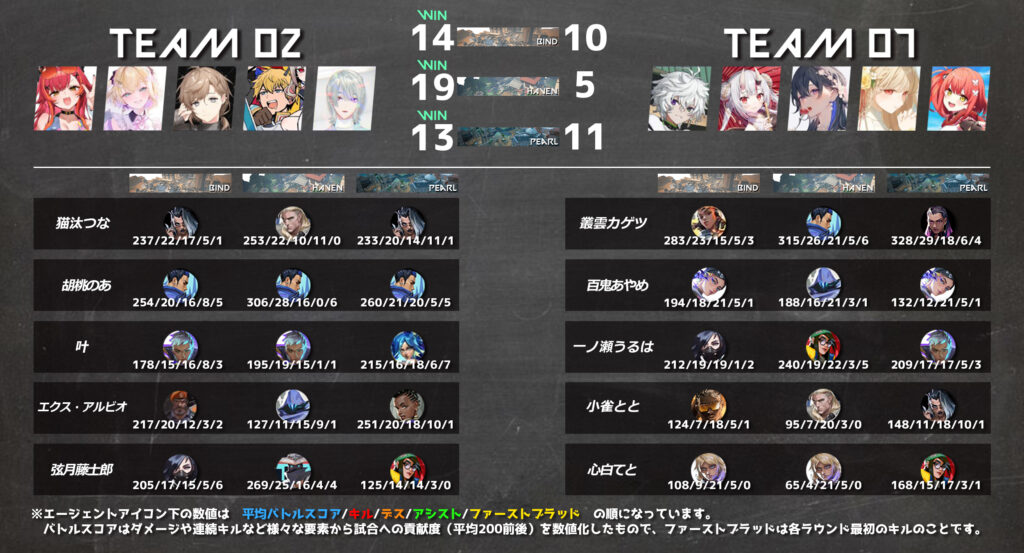 各スクリムの結果になります。ピックエージェントやスコアも簡単にわかるようになっているので是非ご覧下さい。