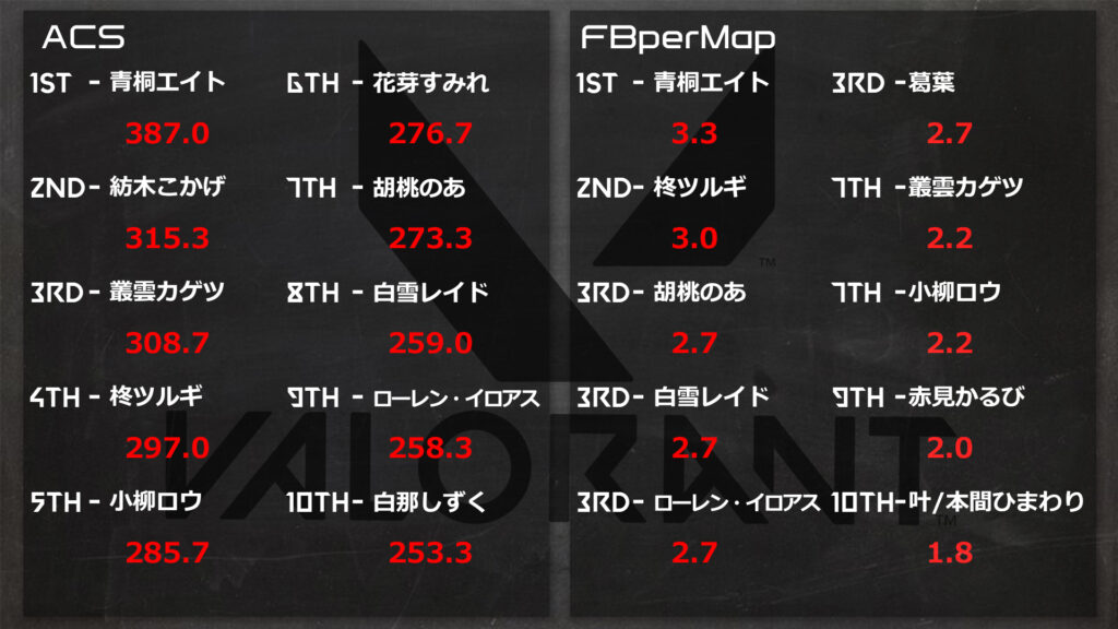 今回は表題大会について、スクリムのDAY1の結果と、様々な成績をまとめました。