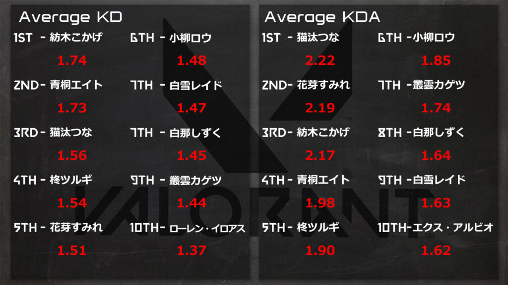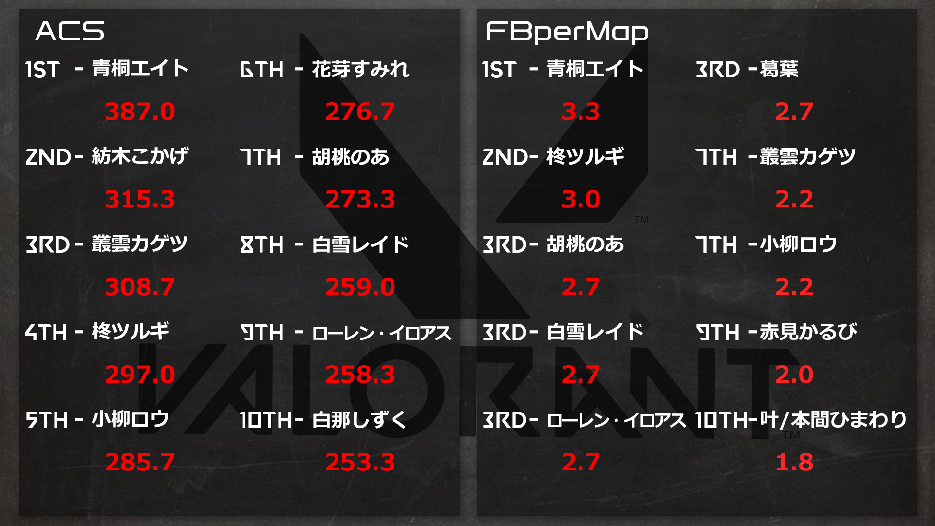| 一ノ瀬うるは | ヴァイパー/キルジョイ | 220.3 | 55 | 58 | 9 | 10 | 72 | 0.95 | 1.10 | 1.7 | 0.139 | 3 |