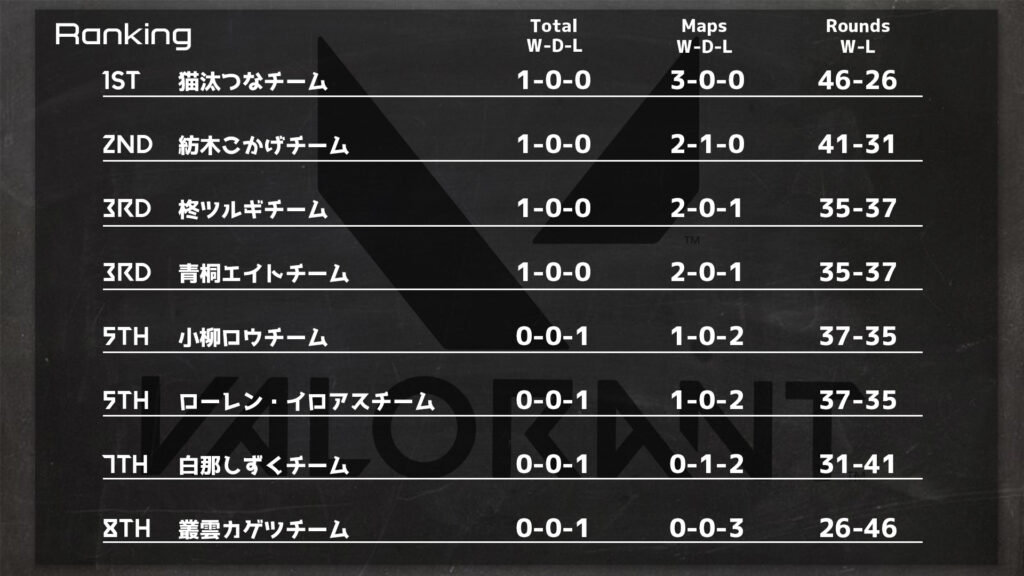 ※総合順位付け優先順位はトータル勝利数>マップ勝利数差分>ラウンド勝利数差分となっています。