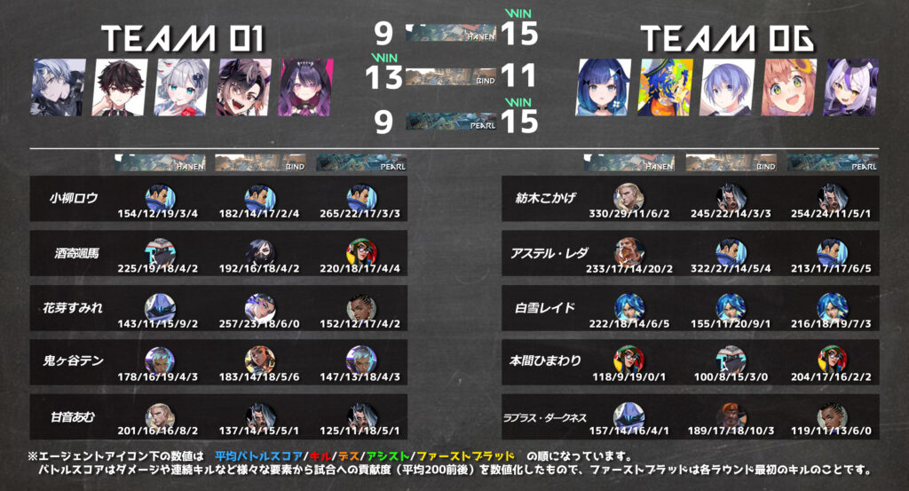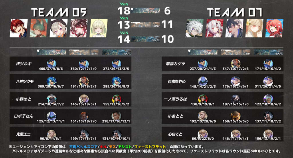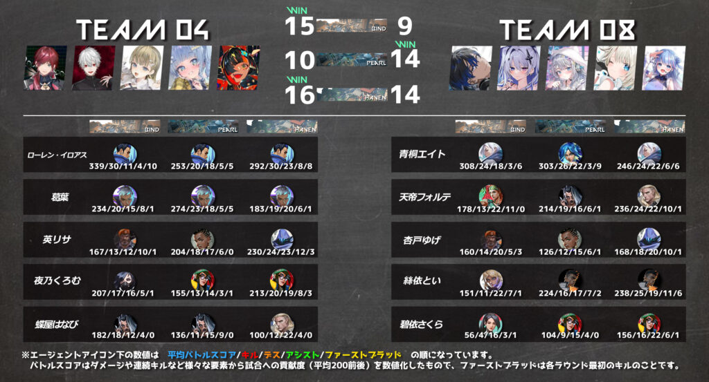 各スクリムの結果になります。ピックエージェントやスコアも簡単にわかるようになっているので是非ご覧下さい。
