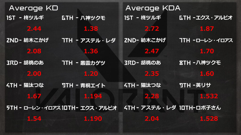 | 夜乃くろむ | ヴァイパー/キルジョイ | 191.7 | 50 | 49 | 16 | 5 | 78 | 1.02 | 1.35 | 1.7 | 0.064 | 3 |