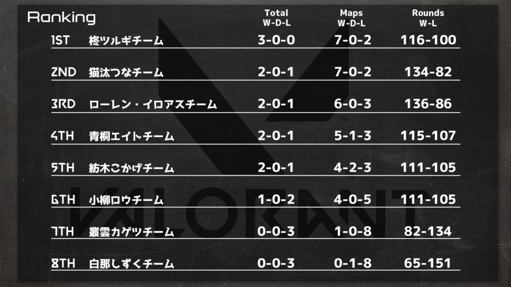 ※総合順位付け優先順位はトータル勝利数>マップ勝利数差分>ラウンド勝利数差分となっています。